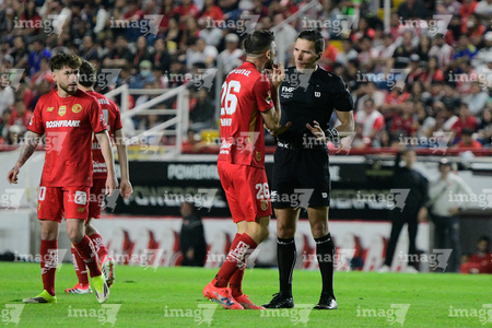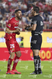 Aguascalientes, Aguascalientes, 21 de febrero de 2026. Alexis Peña en reclamo a Yonatan Peinado Aguirre, árbitro central, durante el partido correspondiente a la jornada 7 del torneo Clausura 2026 de la Liga BBVA MX, entre los Rayos del Necaxa y los Diablos Rojos del Toluca, realizado en el estadio Victoria. Foto: Imago7/ Pablo Ramírez