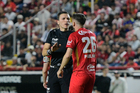 Aguascalientes, Aguascalientes, 21 de febrero de 2026. Paulinho en reclamo a Yonatan Peinado Aguirre, árbitro central, durante el partido correspondiente a la jornada 7 del torneo Clausura 2026 de la Liga BBVA MX, entre los Rayos del Necaxa y los Diablos Rojos del Toluca, realizado en el estadio Victoria. Foto: Imago7/ Rafael Vadillo