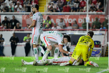 Aguascalientes, Aguascalientes, 21 de febrero de 2026. Alexis Peña resultó lesionado, durante el partido correspondiente a la jornada 7 del torneo Clausura 2026 de la Liga BBVA MX, entre los Rayos del Necaxa y los Diablos Rojos del Toluca, realizado en el estadio Victoria. Foto: Imago7/ Pablo Ramírez