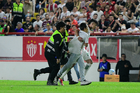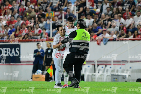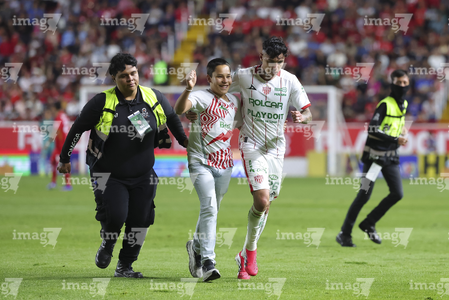 Aguascalientes, Aguascalientes, 21 de febrero de 2026. Un aficionado que ingresó a la cancha, durante el partido correspondiente a la jornada 7 del torneo Clausura 2026 de la Liga BBVA MX, entre los Rayos del Necaxa y los Diablos Rojos del Toluca, realizado en el estadio Victoria. Foto: Imago7/ Pablo Ramírez
