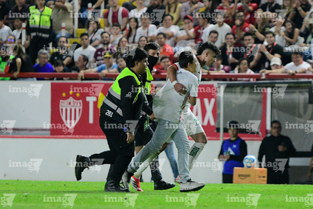 Aguascalientes, Aguascalientes, 21 de febrero de 2026. Emilio Lara y un aficionado que ingresó a la cancha, durante el partido correspondiente a la jornada 7 del torneo Clausura 2026 de la Liga BBVA MX, entre los Rayos del Necaxa y los Diablos Rojos del Toluca, realizado en el estadio Victoria. Foto: Imago7/ Pablo Ramírez