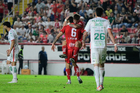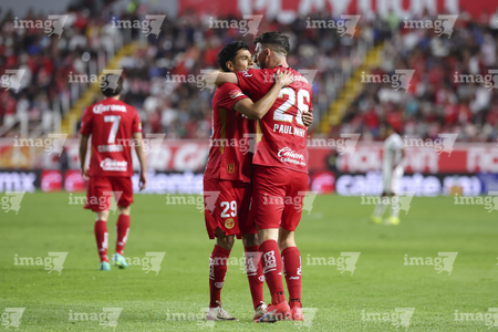 Aguascalientes, Aguascalientes, 21 de febrero de 2026. Jorge Díaz Price y Paulinho en festejo de gol, durante el partido correspondiente a la jornada 7 del torneo Clausura 2026 de la Liga BBVA MX, entre los Rayos del Necaxa y los Diablos Rojos del Toluca, realizado en el estadio Victoria. Foto: Imago7/ Rafael Vadillo