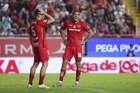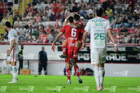Aguascalientes, Aguascalientes, 21 de febrero de 2026. Federico Pereira y Franco Rossi en festejo de gol, durante el partido correspondiente a la jornada 7 del torneo Clausura 2026 de la Liga BBVA MX, entre los Rayos del Necaxa y los Diablos Rojos del Toluca, realizado en el estadio Victoria. Foto: Imago7/ Pablo Ramírez