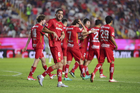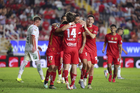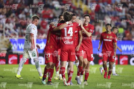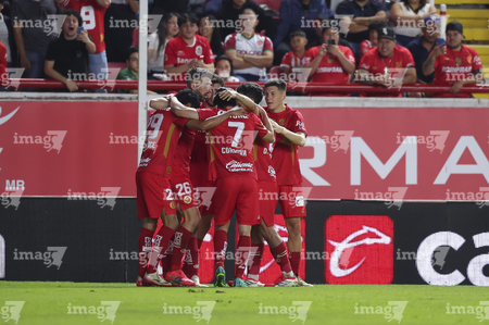 Aguascalientes, Aguascalientes, 21 de febrero de 2026. Jugadores del Toluca en festejo de gol, durante el partido correspondiente a la jornada 7 del torneo Clausura 2026 de la Liga BBVA MX, entre los Rayos del Necaxa y los Diablos Rojos del Toluca, realizado en el estadio Victoria. Foto: Imago7/ Rafael Vadillo
