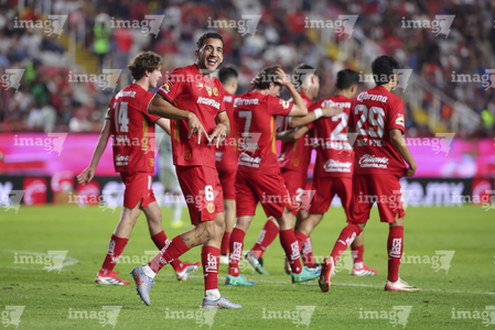 Aguascalientes, Aguascalientes, 21 de febrero de 2026. Federico Pereira y Franco Rossi en festejo de gol durante el partido correspondiente a la jornada 7 del torneo Clausura 2026 de la Liga BBVA MX, entre los Rayos del Necaxa y los Diablos Rojos del Toluca, realizado en el estadio Victoria. Foto: Imago7/ Rafael Vadillo