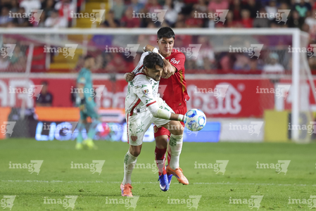 Aguascalientes, Aguascalientes, 21 de febrero de 2026. Emilio Lara y Jorge Díaz Price, durante el partido correspondiente a la jornada 7 del torneo Clausura 2026 de la Liga BBVA MX, entre los Rayos del Necaxa y los Diablos Rojos del Toluca, realizado en el estadio Victoria. Foto: Imago7/ Rafael Vadillo