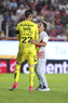 Aguascalientes, Aguascalientes, 21 de febrero de 2026. Lorenzo Faravelli y Jesús Angulo "Canelo", durante el partido correspondiente a la jornada 7 del torneo Clausura 2026 de la Liga BBVA MX, entre los Rayos del Necaxa y los Diablos Rojos del Toluca, realizado en el estadio Victoria. Foto: Imago7/ Rafael Vadillo