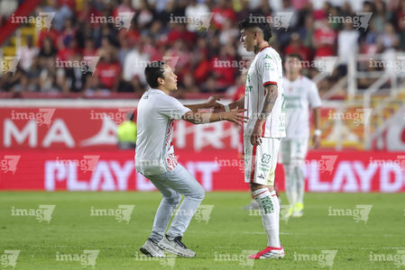 Aguascalientes, Aguascalientes, 21 de febrero de 2026. Luis Unsain y un aficionado que ingresó a la cancha, durante el partido correspondiente a la jornada 7 del torneo Clausura 2026 de la Liga BBVA MX, entre los Rayos del Necaxa y los Diablos Rojos del Toluca, realizado en el estadio Victoria. Foto: Imago7/ Rafael Vadillo