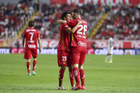Aguascalientes, Aguascalientes, 21 de febrero de 2026. Jugadores del Toluca en festejo, durante el partido correspondiente a la jornada 7 del torneo Clausura 2026 de la Liga BBVA MX, entre los Rayos del Necaxa y los Diablos Rojos del Toluca, realizado en el estadio Victoria. Foto: Imago7/ Rafael Vadillo