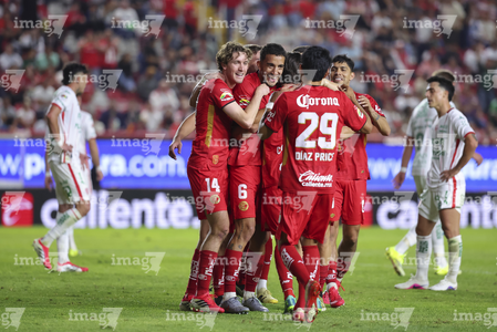 Aguascalientes, Aguascalientes, 21 de febrero de 2026. Jugadores del Toluca en festejo de gol, durante el partido correspondiente a la jornada 7 del torneo Clausura 2026 de la Liga BBVA MX, entre los Rayos del Necaxa y los Diablos Rojos del Toluca, realizado en el estadio Victoria. Foto: Imago7/ Pablo Ramírez