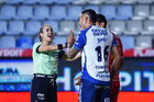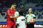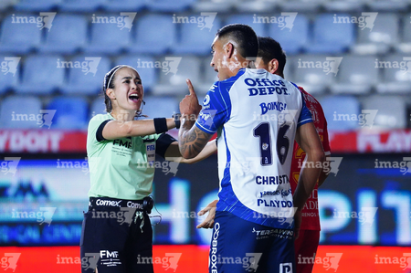 Pachuca, Hidalgo, 3 de marzo de 2026. Katia Itzel García, árbitra y Christian Rivera durante el partido correspondiente a la jornada 9 del torneo Clausura 2026 de la Liga BBVA MX, entre los Tuzos del Pachuca y los Rayos del Necaxa, realizado en el estadio Hidalgo. Foto: Imago7/ Jacqueline Pedraza