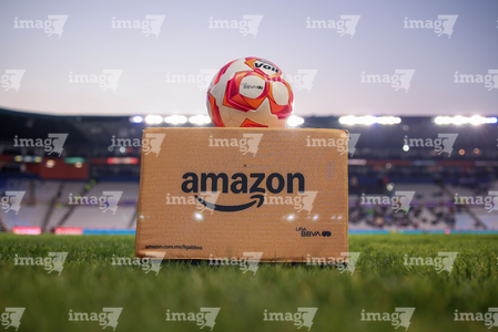 Pachuca, Hidalgo, 3 de marzo de 2026. Balón de futbol Voit Aereus sobre caja de Amazon, durante el partido correspondiente a la jornada 9 del torneo Clausura 2026 de la Liga BBVA MX, entre los Tuzos del Pachuca y los Rayos del Necaxa, realizado en el estadio Hidalgo. Foto: Imago7/ Elizabeth Hernández