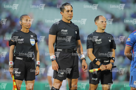 Torreón, Coahuila, 3 de marzo de 2026. Enedina Caudillo, árbitra asistente, Iván Antonio López, árbitro central y Francisco Javier González, árbitro asistente, durante el partido correspondiente a la jornada 9 del torneo Clausura 2026 de la Liga BBVA MX, entre los Guerreros de Santos Laguna y la Máquina Celeste del Cruz Azul, realizado en el estadio Corona. Foto: Imago7/ Saul Perales