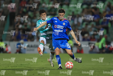 Torreón, Coahuila, 3 de marzo de 2026. Juan Echilvestre y Lucca Vuoso, durante el partido correspondiente a la jornada 9 del torneo Clausura 2026 de la Liga BBVA MX, entre los Guerreros de Santos Laguna y la Máquina Celeste del Cruz Azul, realizado en el estadio Corona. Foto: Imago7/ Saul Perales