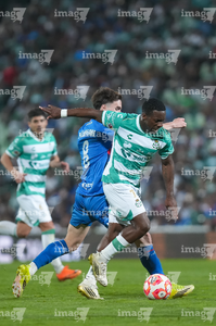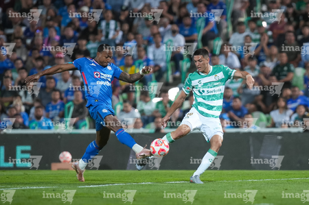Torreón, Coahuila, 3 de marzo de 2026. Willer Ditta y Ezequiel Bullaude, durante el partido correspondiente a la jornada 9 del torneo Clausura 2026 de la Liga BBVA MX, entre los Guerreros de Santos Laguna y la Máquina Celeste del Cruz Azul, realizado en el estadio Corona. Foto: Imago7/ Erick Saavedra