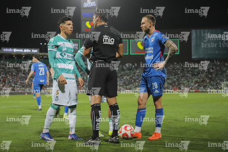 Torreón, Coahuila, 3 de marzo de 2026. Aldo López e Iván Antonio López, árbitro central, durante el partido correspondiente a la jornada 9 del torneo Clausura 2026 de la Liga BBVA MX, entre los Guerreros de Santos Laguna y la Máquina Celeste del Cruz Azul, realizado en el estadio Corona. Foto: Imago7/ Saul Perales