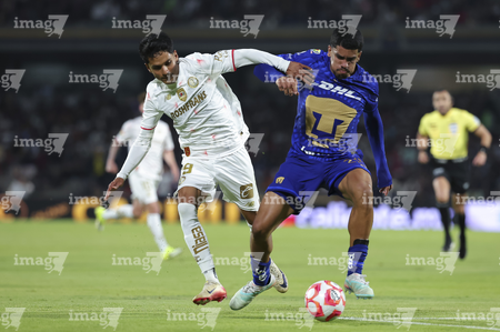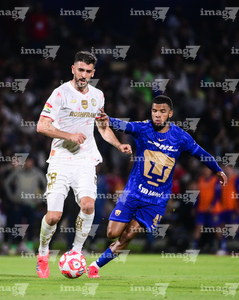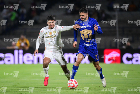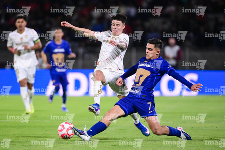 Ciudad de México, 3 de marzo de 2026. Robert Morales y Federico Pereira, durante el partido correspondiente a la jornada 9 del torneo Clausura 2026 de la Liga BBVA MX, entre los Pumas de la UNAM y los Diablos Rojos del Toluca, realizado en el estadio Olímpico Universitario. Foto: Imago7/ Alexis Chavez