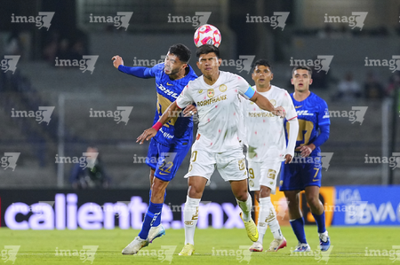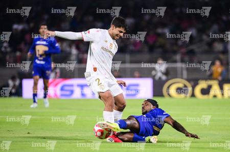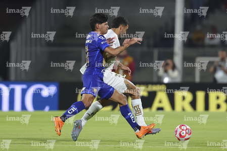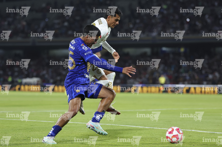 Ciudad de México, 3 de marzo de 2026. Paulinho y Pedro Vite, durante el partido correspondiente a la jornada 9 del torneo Clausura 2026 de la Liga BBVA MX, entre los Pumas de la UNAM y los Diablos Rojos del Toluca, realizado en el estadio Olímpico Universitario. Foto: Imago7/ Alexis Chavez