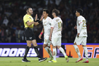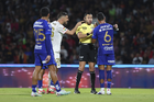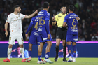 Ciudad de México, 3 de marzo de 2026. Marco Antonio Ortiz, árbitro central y Nathan Silva, durante el partido correspondiente a la jornada 9 del torneo Clausura 2026 de la Liga BBVA MX, entre los Pumas de la UNAM y los Diablos Rojos del Toluca, realizado en el estadio Olímpico Universitario. Foto: Imago7/ Rafael Vadillo