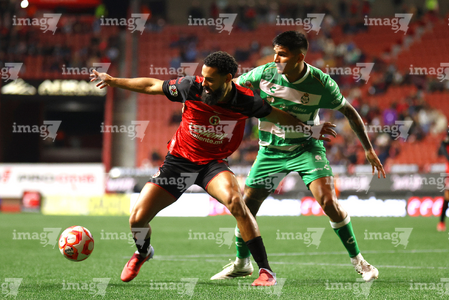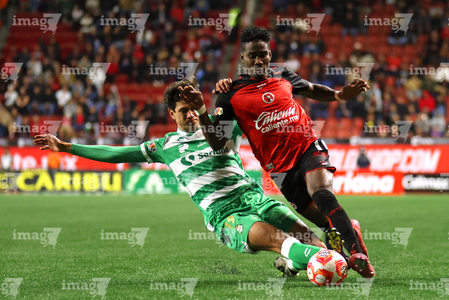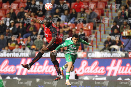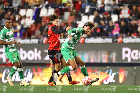 Tijuana, Baja California, 8 de marzo de 2026. Haret Ortega y Adonis Preciado, durante el partido correspondiente a la jornada 10 del torneo Clausura 2026 de la Liga BBVA MX, entre los Xolos de Tijuana y los Guerreros de Santos Laguna, realizado en el estadio Caliente. Foto: Imago7/ David Vega