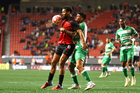Tijuana, Baja California, 8 de marzo de 2026. Frank Boya y Bruno Amione, durante el partido correspondiente a la jornada 10 del torneo Clausura 2026 de la Liga BBVA MX, entre los Xolos de Tijuana y los Guerreros de Santos Laguna, realizado en el estadio Caliente. Foto: Imago7/ David Vega