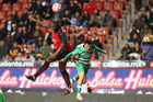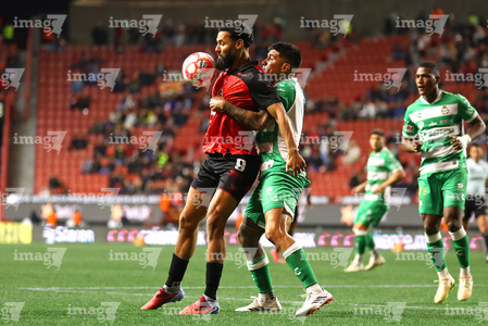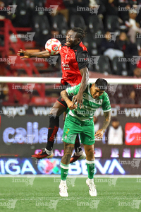 Tijuana, Baja California, 8 de marzo de 2026. Frank Boya y Kevin Picon, durante el partido correspondiente a la jornada 10 del torneo Clausura 2026 de la Liga BBVA MX, entre los Xolos de Tijuana y los Guerreros de Santos Laguna, realizado en el estadio Caliente. Foto: Imago7/ David Vega