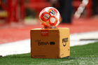 Tijuana, Baja California, 8 de marzo de 2026. Balón de futbol Voit Aereus sobre caja de Amazon, durante el partido correspondiente a la jornada 10 del torneo Clausura 2026 de la Liga BBVA MX, entre los Xolos de Tijuana y los Guerreros de Santos Laguna, realizado en el estadio Caliente. Foto: Imago7/ David Vega