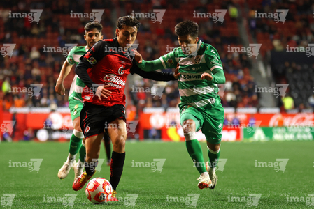 Tijuana, Baja California, 8 de marzo de 2026. Ramiro Árciga y Oscar Estupiñan, durante el partido correspondiente a la jornada 10 del torneo Clausura 2026 de la Liga BBVA MX, entre los Xolos de Tijuana y los Guerreros de Santos Laguna, realizado en el estadio Caliente. Foto: Imago7/ David Vega