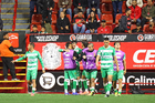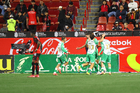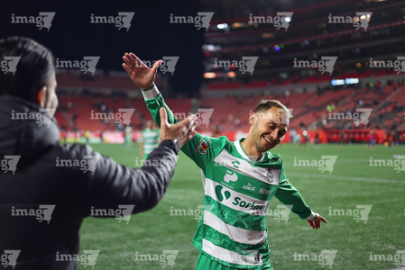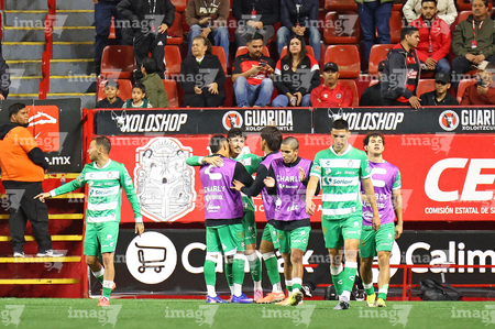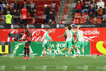 Tijuana, Baja California, 8 de marzo de 2026. Jugadores del Santos Laguna en festejo de gol, durante el partido correspondiente a la jornada 10 del torneo Clausura 2026 de la Liga BBVA MX, entre los Xolos de Tijuana y los Guerreros de Santos Laguna, realizado en el estadio Caliente. Foto: Imago7/ David Vega