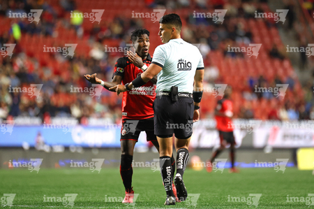Tijuana, Baja California, 8 de marzo de 2026. Adonis Preciado en reclamo a Guillermo Pacheco Larios, árbitro central, durante el partido correspondiente a la jornada 10 del torneo Clausura 2026 de la Liga BBVA MX, entre los Xolos de Tijuana y los Guerreros de Santos Laguna, realizado en el estadio Caliente. Foto: Imago7/ David Vega