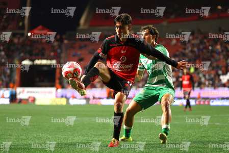 Tijuana, Baja California, 8 de marzo de 2026. Rafael Fernández y Lucas Di Yorio, durante el partido correspondiente a la jornada 10 del torneo Clausura 2026 de la Liga BBVA MX, entre los Xolos de Tijuana y los Guerreros de Santos Laguna, realizado en el estadio Caliente. Foto: Imago7/ David Vega