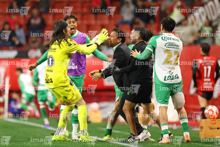 Tijuana, Baja California, 8 de marzo de 2026. Carlos Acevedo y Omar Tapia, director técnico en festejo, durante el partido correspondiente a la jornada 10 del torneo Clausura 2026 de la Liga BBVA MX, entre los Xolos de Tijuana y los Guerreros de Santos Laguna, realizado en el estadio Caliente. Foto: Imago7/ David Vega