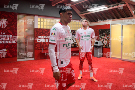 Aguascalientes, Aguascalientes, 20 de marzo de 2026. José Ignacio Rivero y Agustín Oliveros, durante el partido correspondiente a la jornada 12 del torneo Clausura 2026 de la Liga BBVA MX, entre los Rayos del Necaxa y los Xolos de Tijuana, realizado en el estadio Victoria. Foto: Imago7/ Pablo Ramírez
