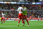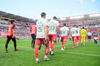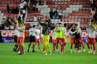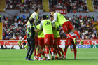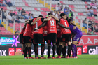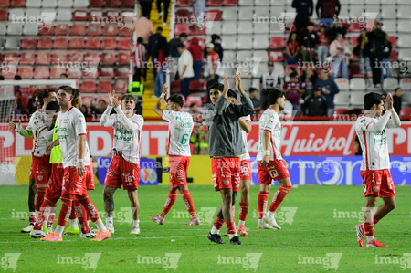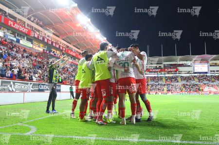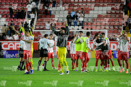 Aguascalientes, Aguascalientes, 20 de marzo de 2026. Jugadores de Necaxa en festejo, durante el partido correspondiente a la jornada 12 del torneo Clausura 2026 de la Liga BBVA MX, entre los Rayos del Necaxa y los Xolos de Tijuana, realizado en el estadio Victoria. Foto: Imago7/ Pablo Ramírez