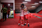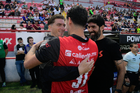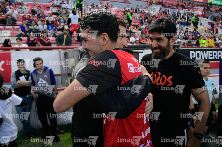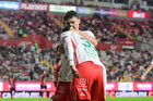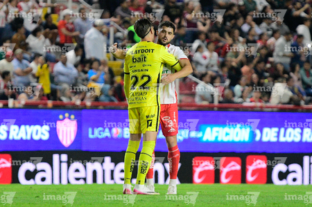 Aguascalientes, Aguascalientes, 20 de marzo de 2026. Luis Unsain y Agustín Oliveros en festejo, durante el partido correspondiente a la jornada 12 del torneo Clausura 2026 de la Liga BBVA MX, entre los Rayos del Necaxa y los Xolos de Tijuana, realizado en el estadio Victoria. Foto: Imago7/ Pablo Ramírez