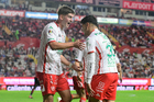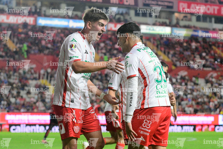Aguascalientes, Aguascalientes, 20 de marzo de 2026. Tomas Badaloni y Javier Ruiz en festejo de gol, durante el partido correspondiente a la jornada 12 del torneo Clausura 2026 de la Liga BBVA MX, entre los Rayos del Necaxa y los Xolos de Tijuana, realizado en el estadio Victoria. Foto: Imago7/ Pablo Ramírez