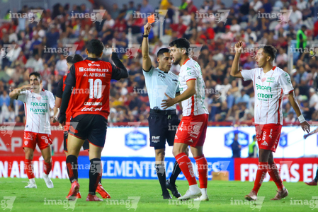 Aguascalientes, Aguascalientes, 20 de marzo de 2026. Martín Molina Astorga, árbitro central muestra tarjeta roja de expulsión, durante el partido correspondiente a la jornada 12 del torneo Clausura 2026 de la Liga BBVA MX, entre los Rayos del Necaxa y los Xolos de Tijuana, realizado en el estadio Victoria. Foto: Imago7/ Rogelio Davila