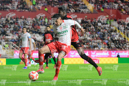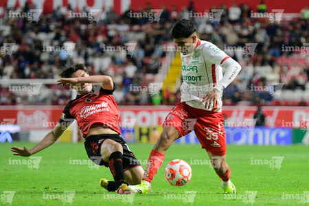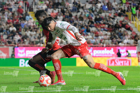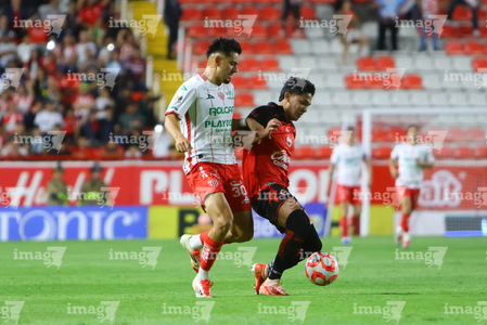 Aguascalientes, Aguascalientes, 20 de marzo de 2026. Emilio Lara y Adonis Preciado, durante el partido correspondiente a la jornada 12 del torneo Clausura 2026 de la Liga BBVA MX, entre los Rayos del Necaxa y los Xolos de Tijuana, realizado en el estadio Victoria. Foto: Imago7/ Pablo Ramírez