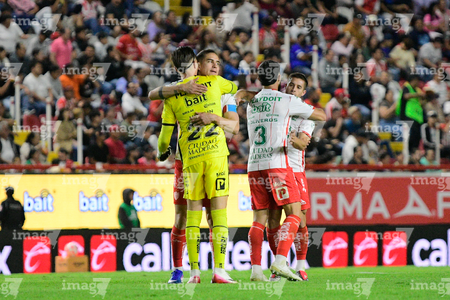 Aguascalientes, Aguascalientes, 20 de marzo de 2026. Rafael Fernández y Javier Ruiz, durante el partido correspondiente a la jornada 12 del torneo Clausura 2026 de la Liga BBVA MX, entre los Rayos del Necaxa y los Xolos de Tijuana, realizado en el estadio Victoria. Foto: Imago7/ Pablo Ramírez