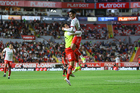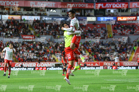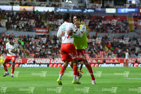 Aguascalientes, Aguascalientes, 20 de marzo de 2026. Luis Unsain y Alexis Peña en festejo, durante el partido correspondiente a la jornada 12 del torneo Clausura 2026 de la Liga BBVA MX, entre los Rayos del Necaxa y los Xolos de Tijuana, realizado en el estadio Victoria. Foto: Imago7/ Pablo Ramírez