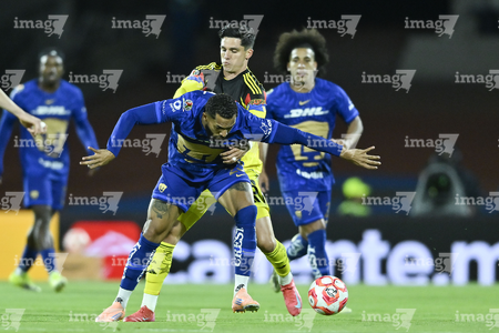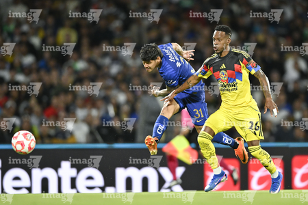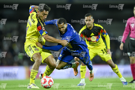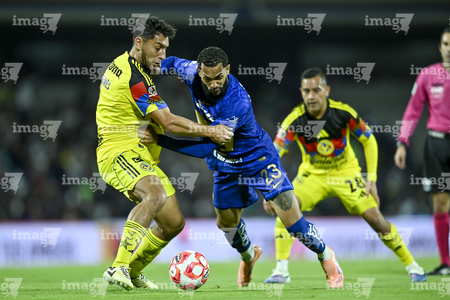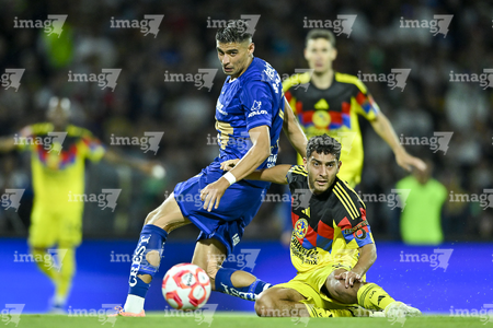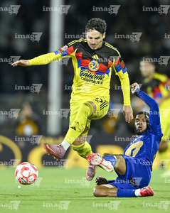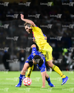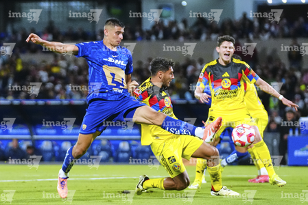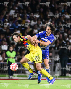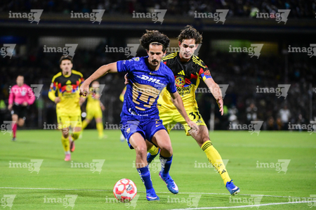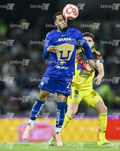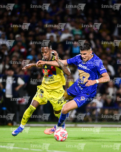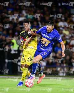 Ciudad de México, 21 de marzo de 2026. Guillermo Martínez y Sebastián Cáceres, durante el partido correspondiente a la jornada 12 del torneo Clausura 2026 de la Liga BBVA MX, entre los Pumas de la UNAM y las Águilas del América, realizado en el estadio Olímpico Universitario. Foto: Imago7/ Carlos Vargas