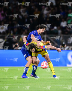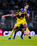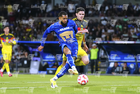 Ciudad de México, 21 de marzo de 2026. Kevin Álvarez y Brian Rodríguez, durante el partido correspondiente a la jornada 12 del torneo Clausura 2026 de la Liga BBVA MX, entre los Pumas de la UNAM y las Águilas del América, realizado en el estadio Olímpico Universitario. Foto: Imago7/ Etzel Espinosa