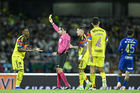 Ciudad de México, 21 de marzo de 2026. César Arturo Ramos, árbitro central muestra tarjeta amarilla de amonestación a Cristian Borja, durante el partido correspondiente a la jornada 12 del torneo Clausura 2026 de la Liga BBVA MX, entre los Pumas de la UNAM y las Águilas del América, realizado en el estadio Olímpico Universitario. Foto: Imago7/ Etzel Espinosa
