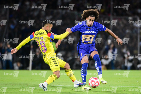 Ciudad de México, 21 de marzo de 2026. Erick Sánchez y Adalberto Carrasquilla "Coco", durante el partido correspondiente a la jornada 12 del torneo Clausura 2026 de la Liga BBVA MX, entre los Pumas de la UNAM y las Águilas del América, realizado en el estadio Olímpico Universitario. Foto: Imago7/ Alexis Chavez