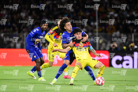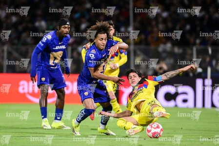 Ciudad de México, 21 de marzo de 2026. José Zuñiga, Alexis Gutiérrez y Fernando Tapia, durante el partido correspondiente a la jornada 12 del torneo Clausura 2026 de la Liga BBVA MX, entre los Pumas de la UNAM y las Águilas del América, realizado en el estadio Olímpico Universitario. Foto: Imago7/ Etzel Espinosa