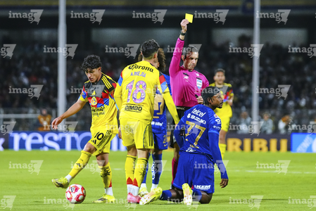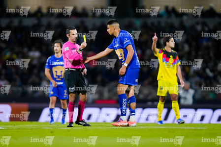 Ciudad de México, 21 de marzo de 2026. César Arturo Ramos, árbitro central muestra tarjeta amarilla de amonestación a Alvaro Angulo, durante el partido correspondiente a la jornada 12 del torneo Clausura 2026 de la Liga BBVA MX, entre los Pumas de la UNAM y las Águilas del América, realizado en el estadio Olímpico Universitario. Foto: Imago7/ Carlos Vargas