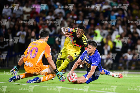 Ciudad de México, 21 de marzo de 2026. Erick Sánchez, Rodolfo Cota y Alvaro Angulo, durante el partido correspondiente a la jornada 12 del torneo Clausura 2026 de la Liga BBVA MX, entre los Pumas de la UNAM y las Águilas del América, realizado en el estadio Olímpico Universitario. Foto: Imago7/ Diego Padilla