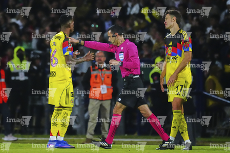 Ciudad de México, 21 de marzo de 2026. César Arturo Ramos Palazuelos, árbitro central consulta el sistema de video asistente del árbitro VAR, durante el partido correspondiente a la jornada 12 del torneo Clausura 2026 de la Liga BBVA MX, entre los Pumas de la UNAM y las Águilas del América, realizado en el estadio Olímpico Universitario. Foto: Imago7/ Diego Padilla