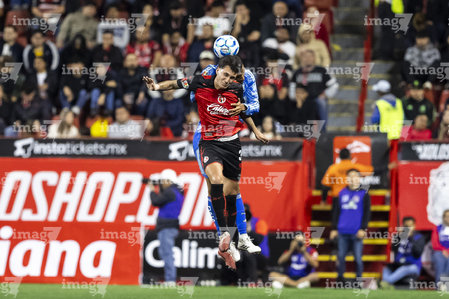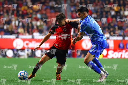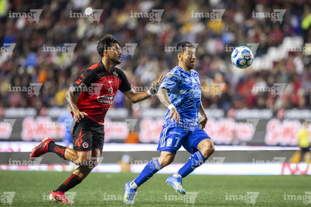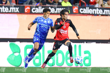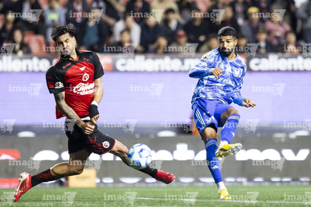 Tijuana, Baja California, 3 de abril de 2026. José Ignacio Rivero y Vladimir Loroña, durante el partido correspondiente a la jornada 13 del torneo Clausura 2026 de la Liga BBVA MX, entre los Xolos de Tijuana y los Tigres de la UANL, realizado en el estadio Caliente. Foto: Imago7/Alejandro Gutiérrez Mora