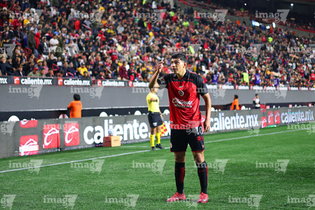 Tijuana, Baja California, 3 de abril de 2026. Kevin Castañeda en festejo de gol, durante el partido correspondiente a la jornada 13 del torneo Clausura 2026 de la Liga BBVA MX, entre los Xolos de Tijuana y los Tigres de la UANL, realizado en el estadio Caliente. Foto: Imago7/Alejandro Gutiérrez Mora